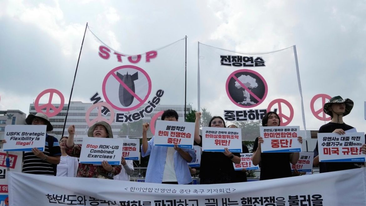 South Korean protesters stage a rally to oppose the joint military exercises, Ulchi Freedom Shield or UFS, between the U.S. and South Korea in front of the presidential office in Seoul, South Korea, Monday, Aug. 18, 2025. The banners read “Stop the military exercise between the U.S. and South Korea.” Credit: AP/Ahn Young-joon