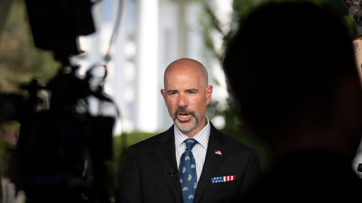Drug Enforcement Agency Administrator Terrance Cole listens as President Donald Trump speaks with reporters in the James Brady Press Briefing Room at the White House, Monday, Aug. 11, 2025, in Washington. Credit: AP/Mark Schiefelbein