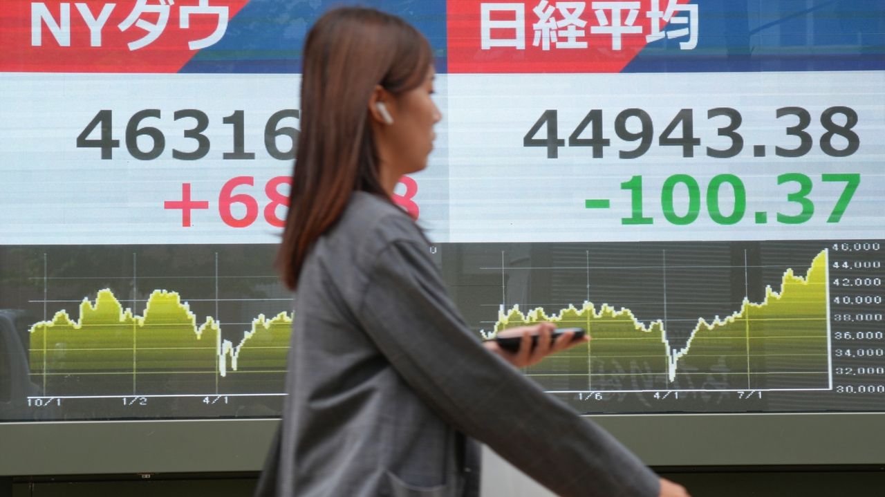 A man looks at an electronic stock board showing Japan’s Nikkei 225 index at a securities firm Tuesday, Sept. 30, 2025, in Tokyo. Credit: AP/Eugene Hoshiko