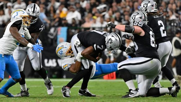 LAS VEGAS — Chargers star pass rusher Khalil Mack injured his left elbow at the end of the first quarter against the Las Vegas Raiders and was out for the rest of Monday night’s game.
