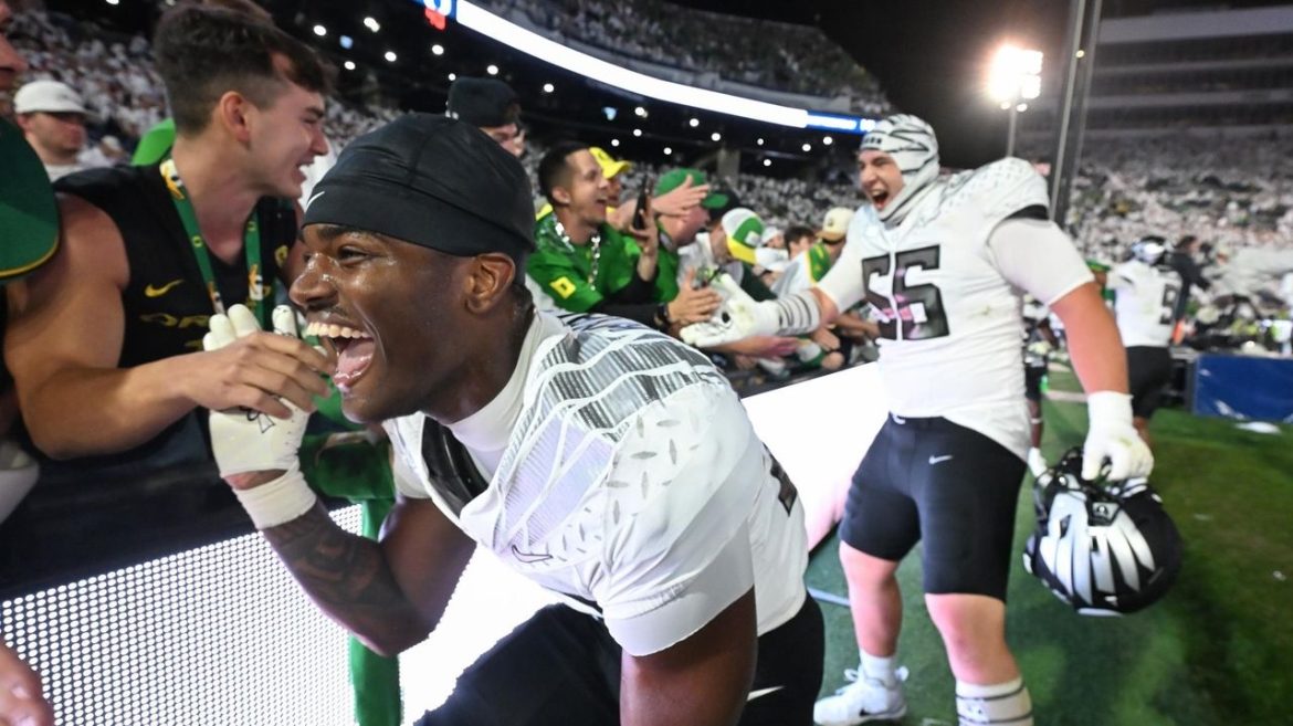 Oregon players celebrate their second overtime win over Penn State during their NCAA college football game, Saturday, Sept. 27, 2025, in State College, Pa. Credit: AP/Barry Reeger