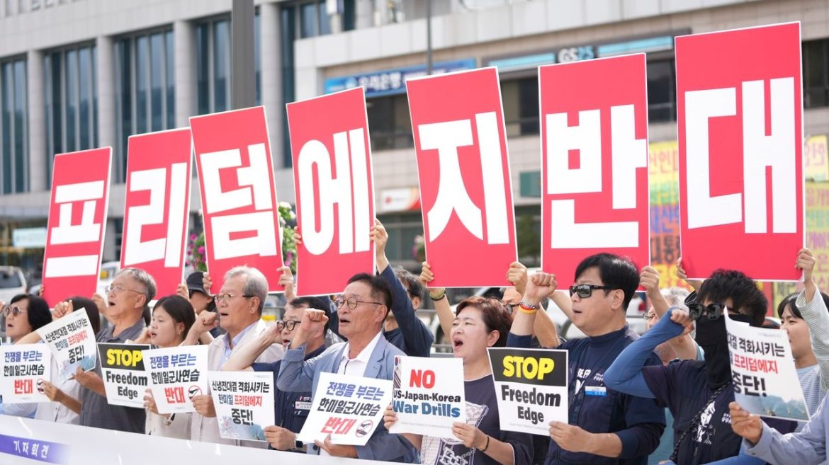 Protesters shout slogans during a press conference to oppose the military exercise called Freedom Edge in Seoul, South Korea, Monday, Sept. 15, 2025. Credit: AP/Lee Jin-man