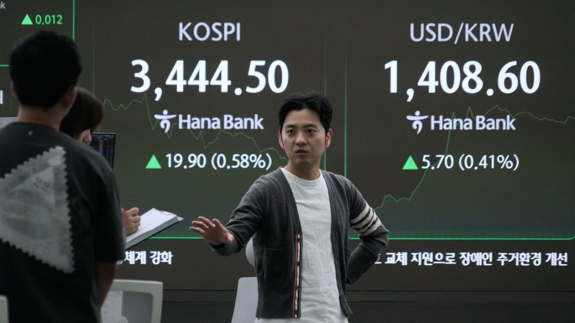 Currency traders work near a screen showing the Korea Composite Stock Price Index (KOSPI), top center, and the foreign exchange rate between U.S. dollar and South Korean won, top left, at the foreign exchange dealing room of the Hana Bank headquarters in Seoul, South Korea, Wednesday, Oct. 1, 2025. Credit: AP/Ahn Young-joon