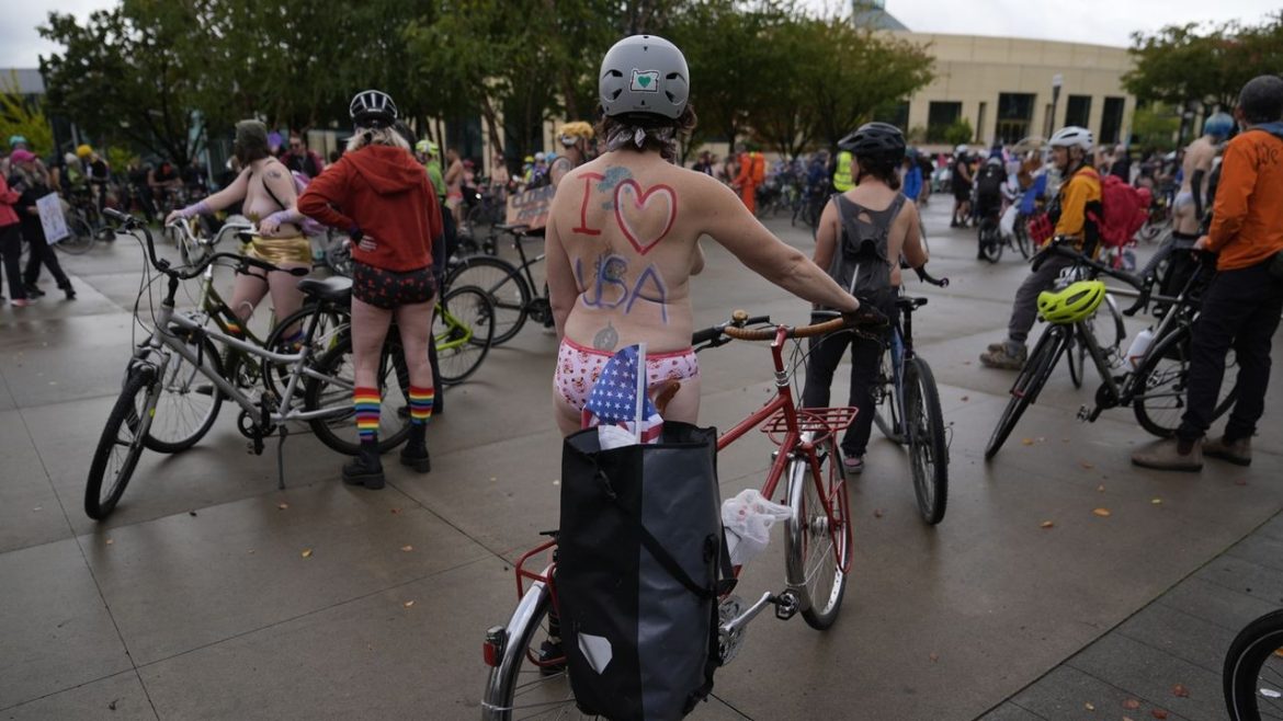 Participants prepare for the Naked Bike Ride protest on Sunday, Oct. 12, 2025, in Portland, Ore. Credit: AP/Jenny Kane