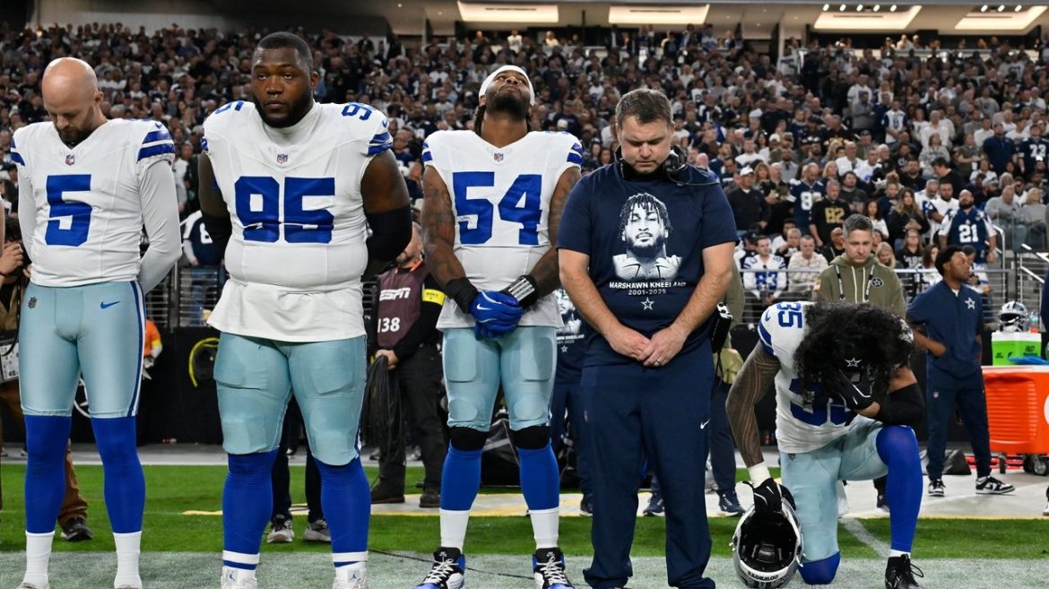 Dallas Cowboys players Bryan Anger (5), Kenny Clark (95), Sam Williams (54), Marist Liufau (35) and Cowboys linebackers coach Dave Borgonzi pause during a moment of silence for teammate Marshawn Kneeland prior to an NFL football game against the Las Vegas Raiders Monday, Nov. 17, 2025, in Las Vegas, in memory of Kneeland who passed away earlier this month. Credit: AP/David Becker