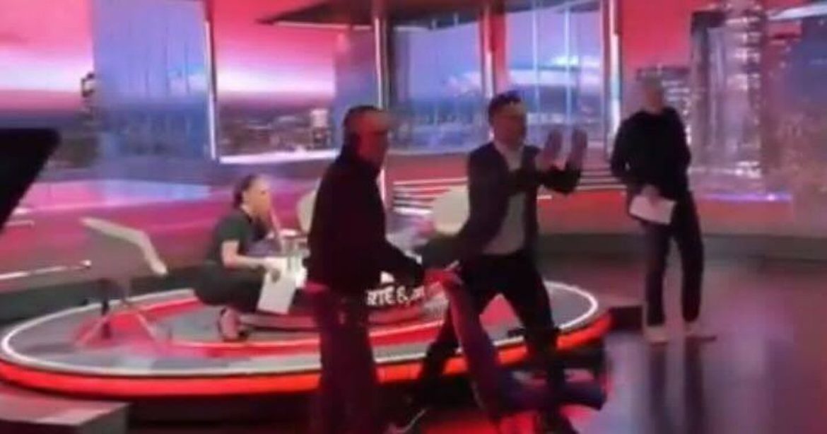 The footage showed Doyle racing through the studio before directing his attention towards the Liverpool midfielder with an explicit outburst. Doyle appears to say: “Suck on that you Liverpool c***.”
