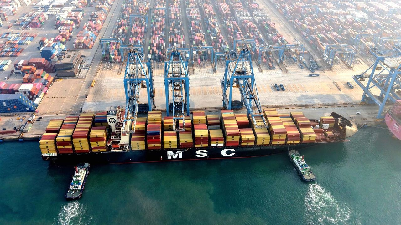 A container ship sails through the harbor in Qingdao in eastern China’s Shandong province, on Nov. 30, 2025. Credit: AP/Uncredited